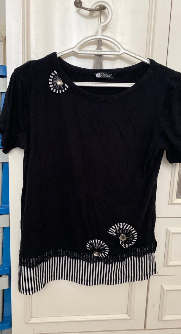 Düğmeli, kısa kollu, yuvarlak yakalı siyah hamile tişörtü. Baskılı detaylar ve çizgili etek ucu ile midi boy, bol kesim.