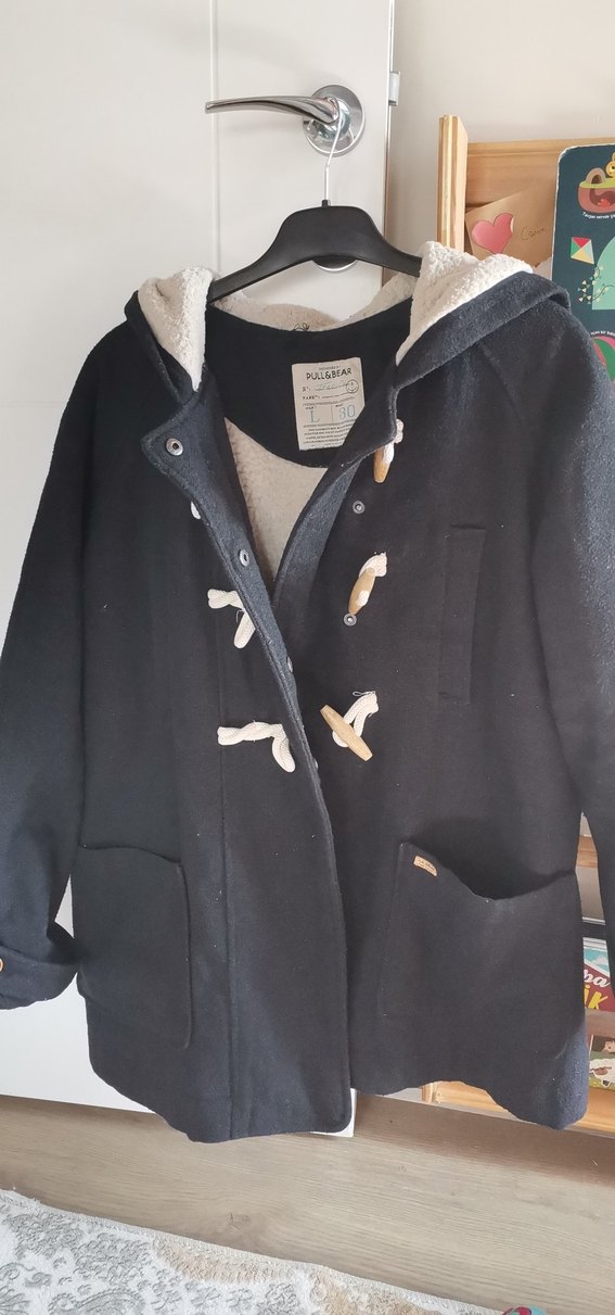 Düğmeli ön ve kesik yaka detaylı, uzun kollu, siyah renkte, yumuşak ve sıcak dokulu fleece astarlı midi uzunlukta bol kesim kaban. Bir sorunu yok