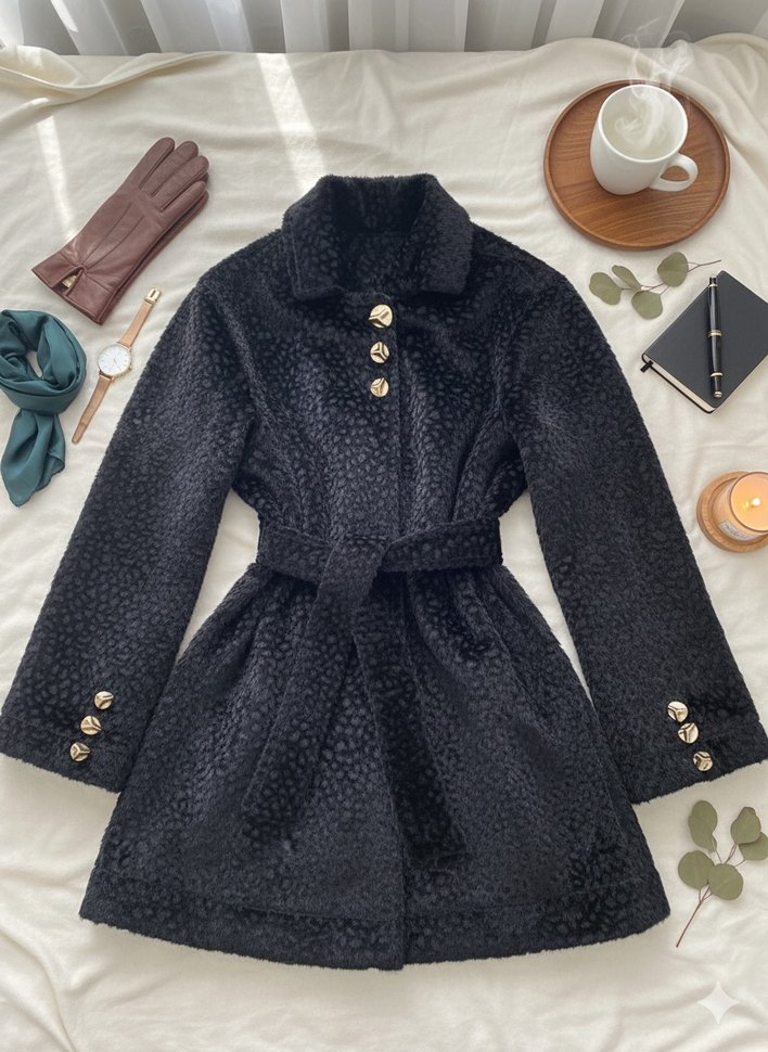 Düğmeli siyah midi kaban, notalı yakalı ve uzun kolludur. Yumuşak, dokulu kumaştan üretilmiş olup, klasik siluet için bel kemeri içerir. Kısa tüyleri olan kendinden leopar desenli şık ve parlak bir kumaşı var boyu 75 cm stndart beden içi asatrsızdır özel dikimdir bir defa tek kullanılmıştır tertemiz sorunsuzdur