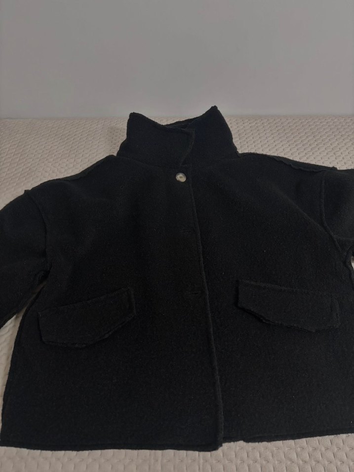 Düğmeli siyah midi kaban, yumuşak ve rahat kumaştan. Notched yaka ve uzun kollu, bol kesimle günlük kullanıma uygun.