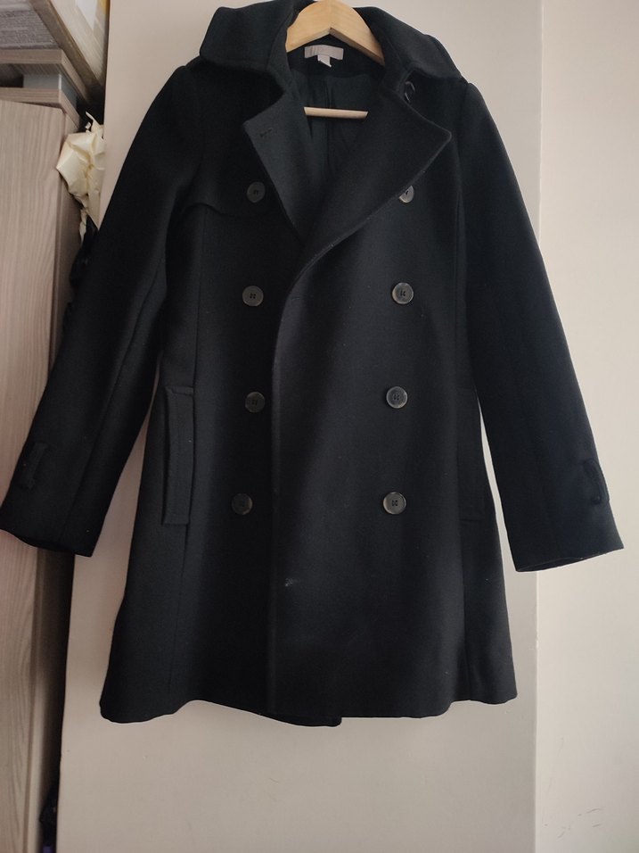 Düğmeli, kesik yakalı, uzun kollu siyah midi kaban. Ofis kullanımı için uygun, rahat kesim ve sade tasarım.