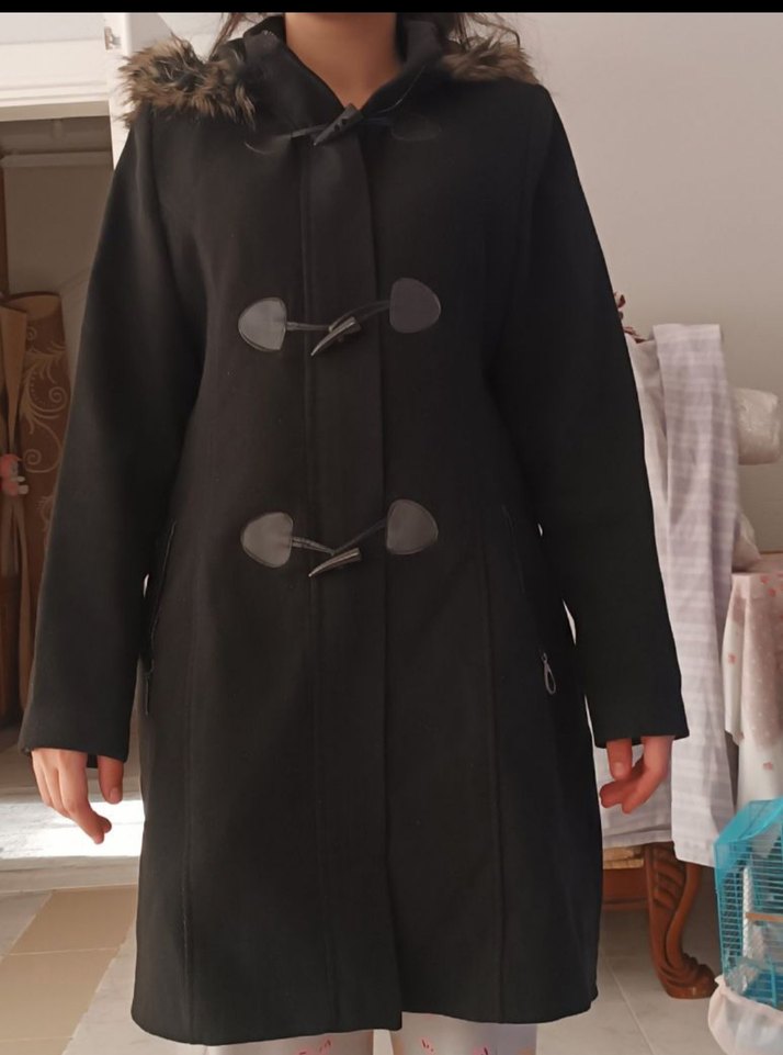 Siyah renkli, düğmeli ve normal kesim uzun kollu kaban. Notlu yaka ve yumuşak, sıcak kumaştan üretilmiştir.