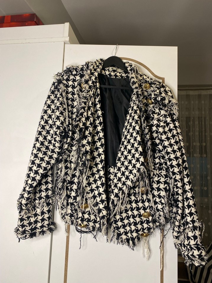 Kadın blazer, düğmeli, kesik yaka ve uzun kolludur. Normal kesim, midi boyda hiç kullanılmamıştır