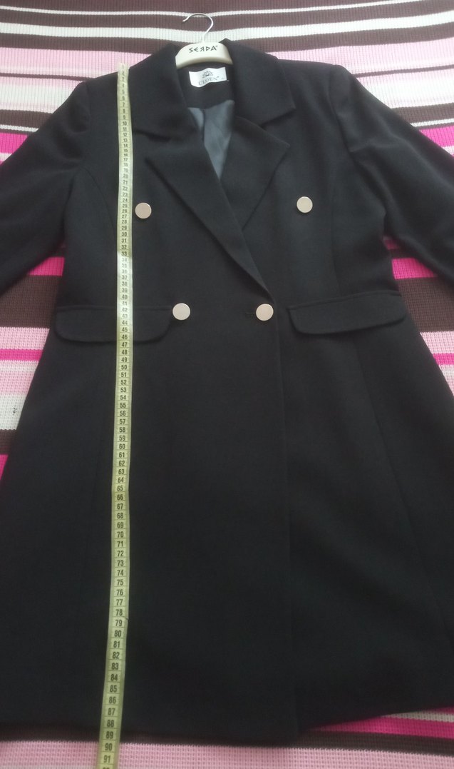 Düğmeli, siyah midi blazer, sentetik kumaştan, ofis kullanımı için uygun, regular fit. Beden: 40 Ön cepleri görsel amaçlı, kullanılır değildir. Çok şık bir cekettir, kumaşı rahat ve esnektir. Sadece bir kez kullandım, ürün yeni ve temizdir.