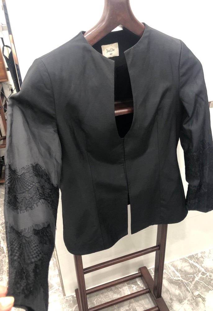 Düğmeli, uzun kollu ve dantel detaylı siyah kadın blazer. İpeksi kumaşı ve midi boyuyla ofis için şık ve gotik tarzda.