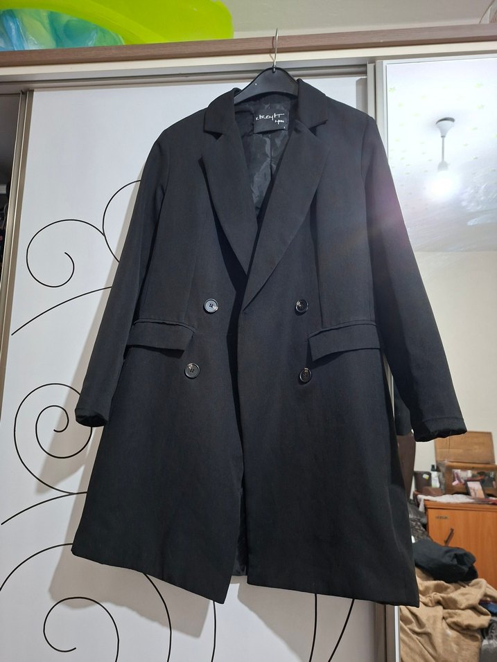 Düğmeli, yakalı siyah kadın blazer. Sentetik kumaştan, midi boyda ve normal kesim. Ofis ve sokak stiline uygun, kolları askılıdır.