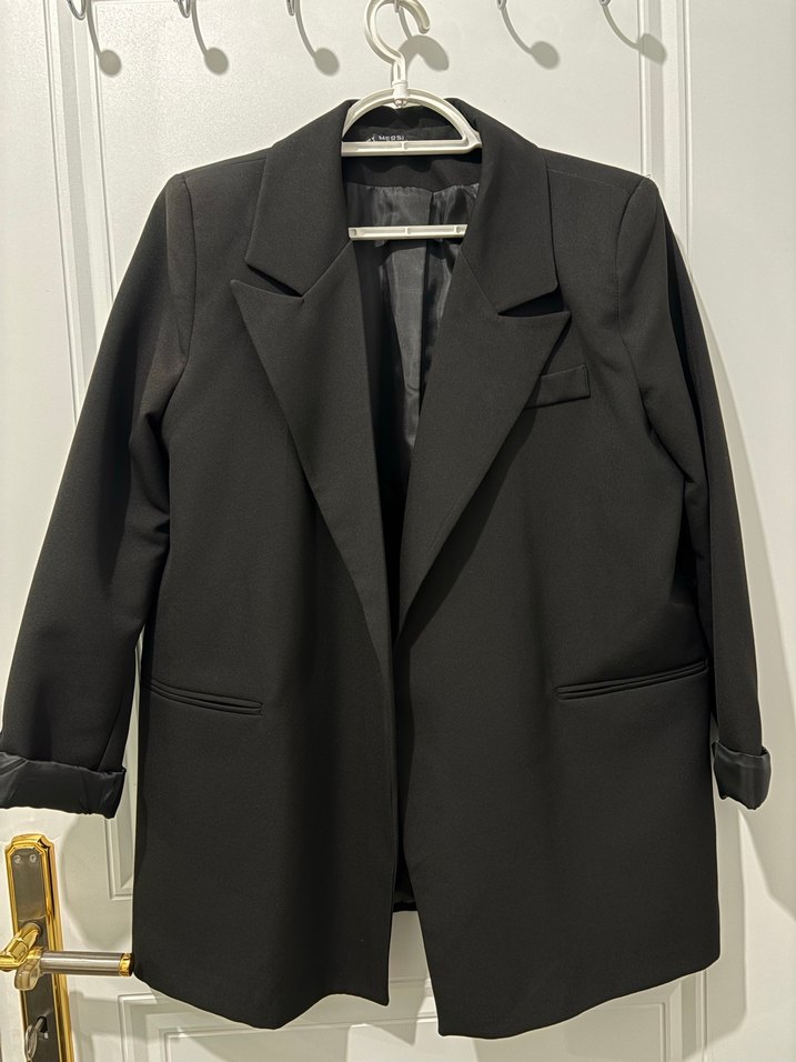 Düğmeli, notched lapel yakalı siyah kadın blazer ceket. Uzun kollu, midi boy ve regular fit. Yumuşak sentetik kumaştan, ofis ve sokak stiline uygun.