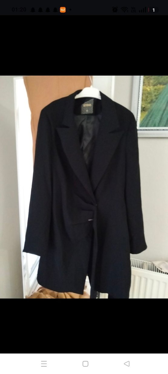 Düğmeli ön kısmı, kesik yakası ve uzun kollu siyah midi uzunluğunda kadın blazer ceket. Yumuşak ve sıcak kumaştan, ofis için uygun.