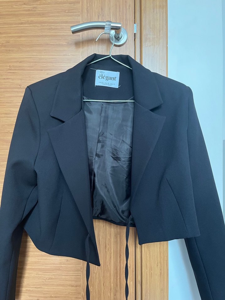 Düğmeli, normal boyda siyah kadın blazer ceket, yaka detaylı. Sentetik kumaştan, Ofis ve günlük kullanıma uygundur.