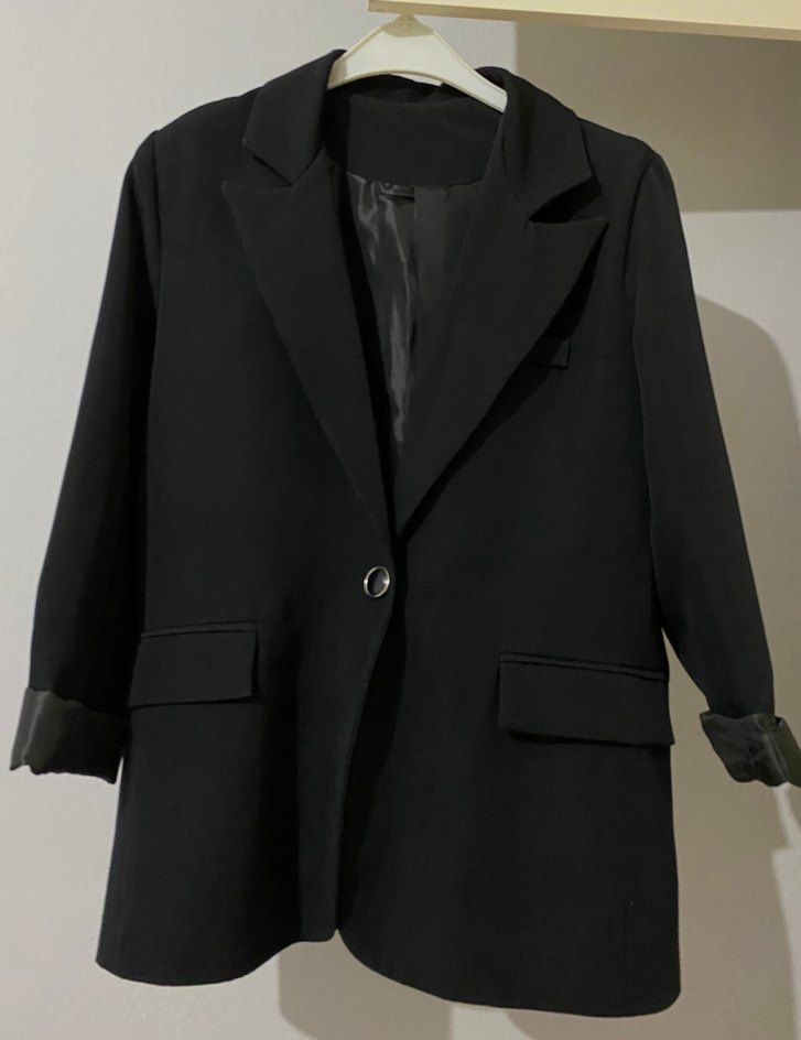 Düğmeli siyah blazer, kesik yaka ve uzun kollu tasarımıyla midi boyda. Sentetik kumaştan, iş ve günlük şıklığı bir arada sunar. Teklife açık