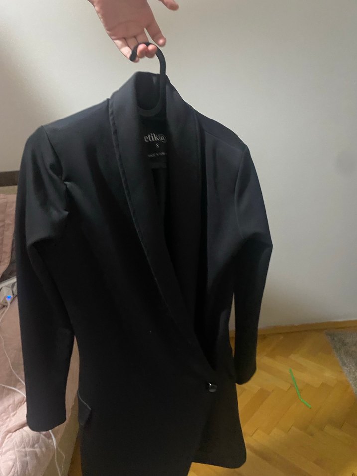 Düğmeli, siyah midi uzunlukta kadın blazer ceket. Notch yakalı, uzun kollu, sentetik kumaştan, ofis için uygun.