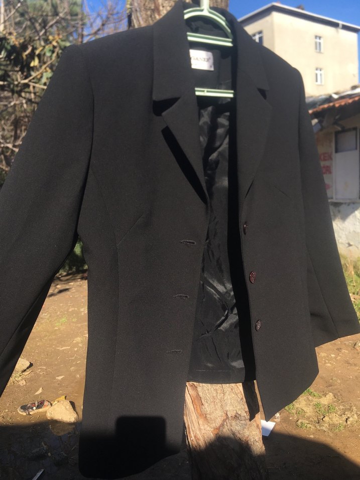 Siyah midi uzunlukta, düğmeli ve keskin yakalı kadın blazer ceket ve etek takımdır . Ofis için uygun, sentetik kumaştan üretilmiştir.