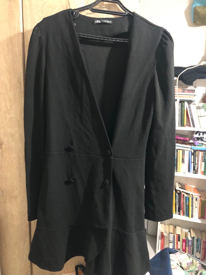 Düğmeli, siyah midi blazer elbise, kesik yaka ve uzun kolludur. Sentetik kumaştan üretilmiş, normal kesim ve ofis kullanımı için uygundur.