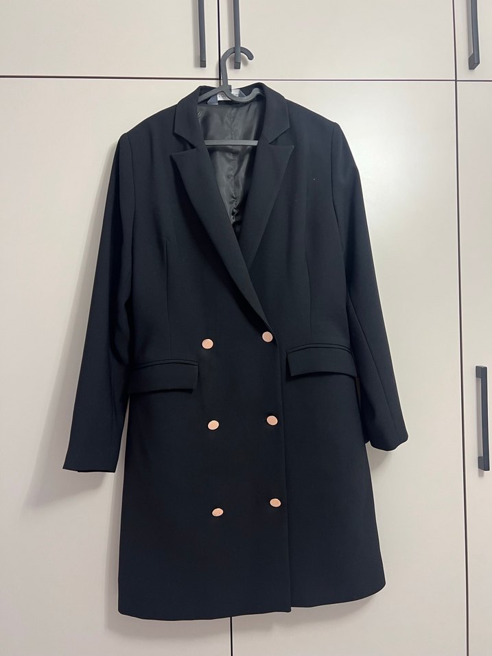 Düğmeli ön kısmı ve kesik yaka detaylı siyah midi uzunlukta kadın blazer elbise Uzun kollu ve normal kesim, ofis için uygun, sentetik kumaştan üretilmiştir.