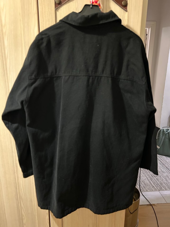 Düğmeli, notched lapel yakalı, uzun kollu siyah keten kadın ceket. Midi boy ve bol kesim, günlük rahat stil için uygundur.