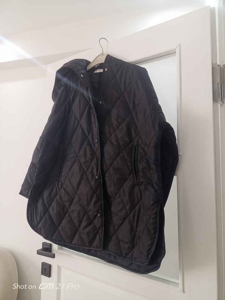 sıfır ürün çıt çıtlı ve kapşonlu siyah midi ceket. Bol kesim, yumuşak, sıcak tutan kumaştan üretilmiştir. Rahat günlük kullanım için uygundur. hiç giyilmedi beden L XL ye uygundur göğüs ölçüsü 65 cm boy 77