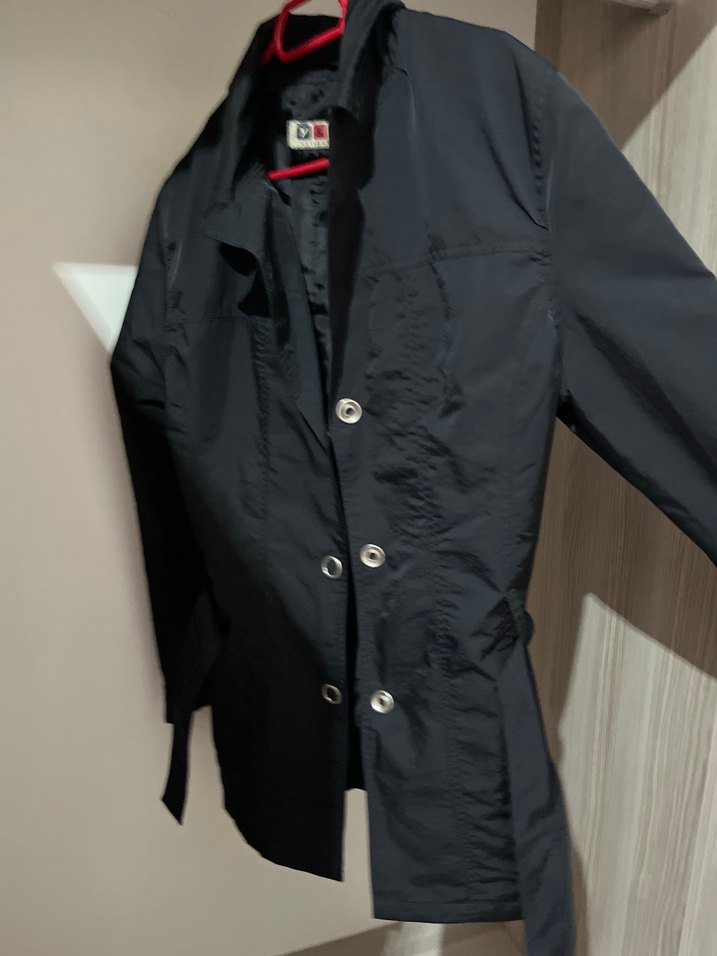 Düğmeli, siyah midi uzunlukta kadın ceket. Notlu yaka, uzun kollu ve regular fit. Sentetik kumaştan, sokak stiline uygun dış mekan kullanımı için.
