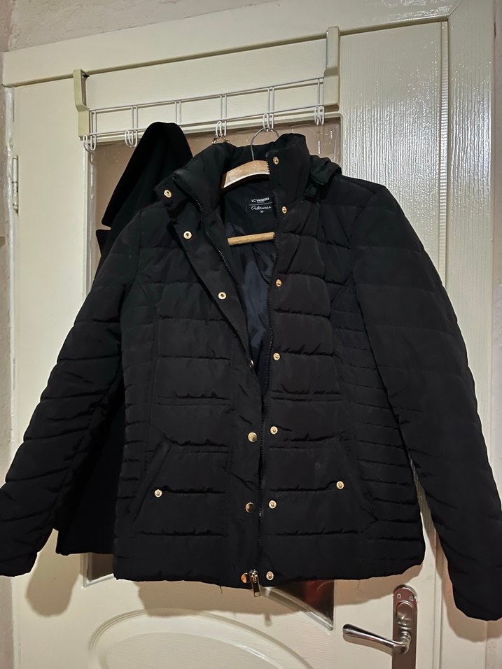 Düğmeli ön kısmı ve uzun kollu, siyah renkli, yumuşak ve sıcak tutan kumaştan yapılmış, oturan kesime sahip midi uzunlukta ceket. Notlu yaka detayı bulunur.
