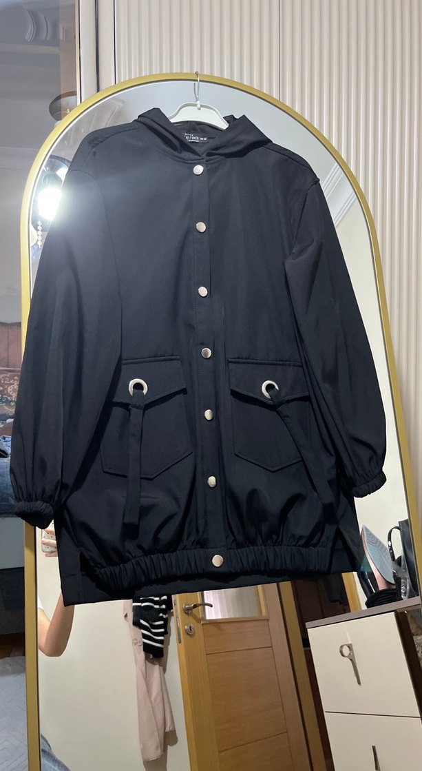 Siyah midi uzunlukta, düğmeli, uzun kollu, cepli ve metal halka detaylı, sentetik kumaştan günlük kullanıma uygun rahat kesim ceket.