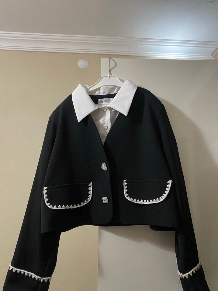 Düğmeli, işlemeli cepler ve manşet detaylı, normal kesim, midi boy siyah triko kadın ceket. Ofis için uygun uzun kollu model.