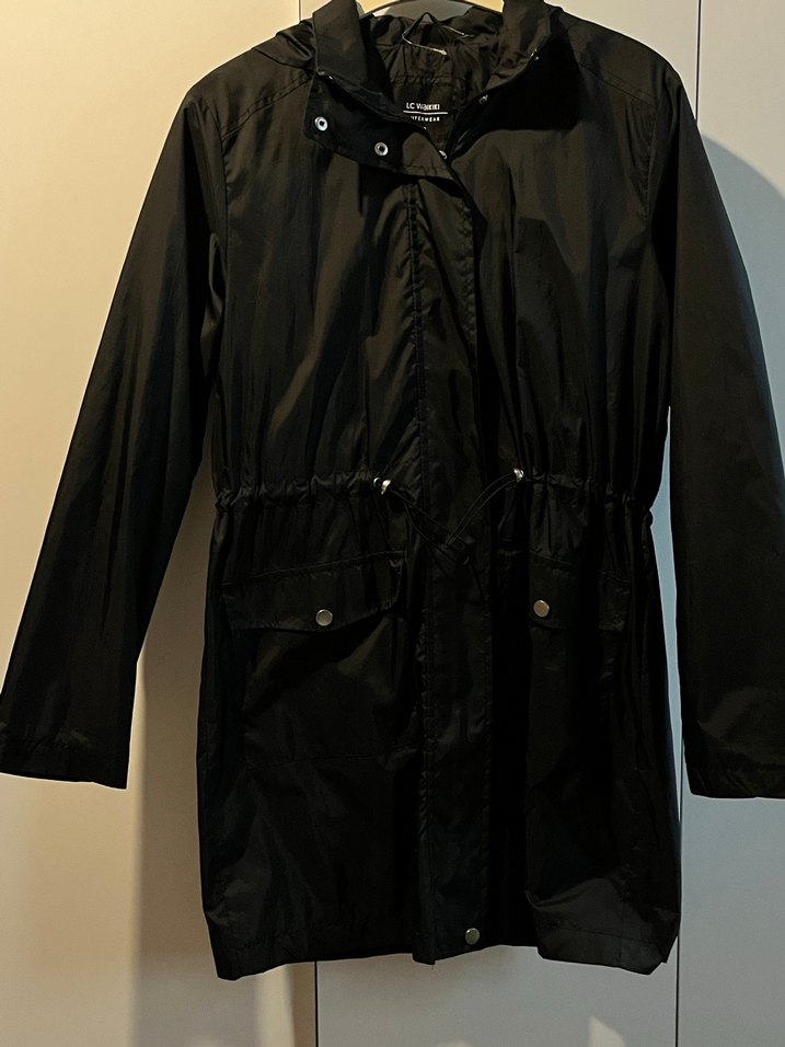 Düğmeli, siyah kadın ceket yağmurluk kumaşındadır çok az kullanıldı hiçbi sıkıntısı yok yeni gibi