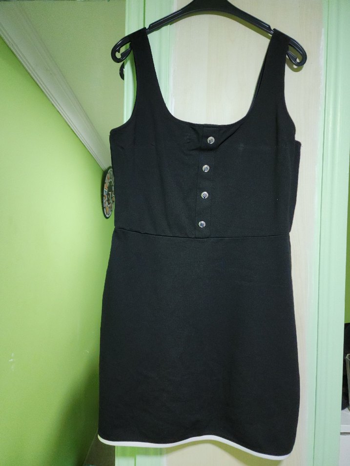 Düğmeli, kolsuz, bisiklet yaka ve siyah midi boyda, vücuda oturan kadın elbisesi. Düz sentetik kumaştan, günlük kullanıma uygun minimalist gotik tarzda.