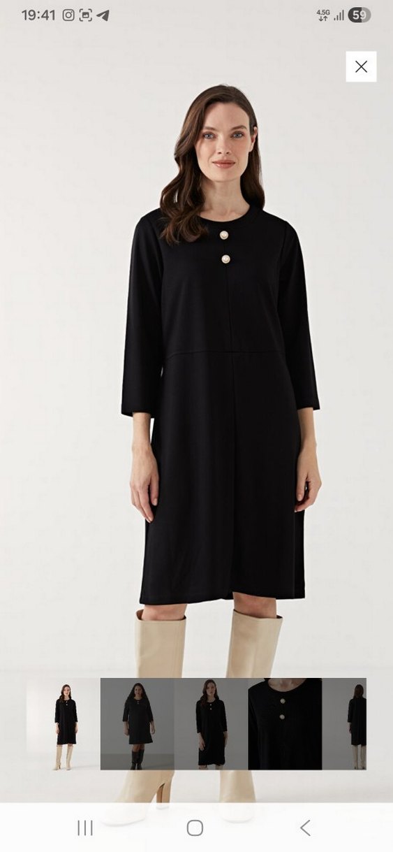 Düğmeli, uzun kollu ve yuvarlak yakalı siyah midi elbise, bol kesim ve ofis kullanımı için uygundur.