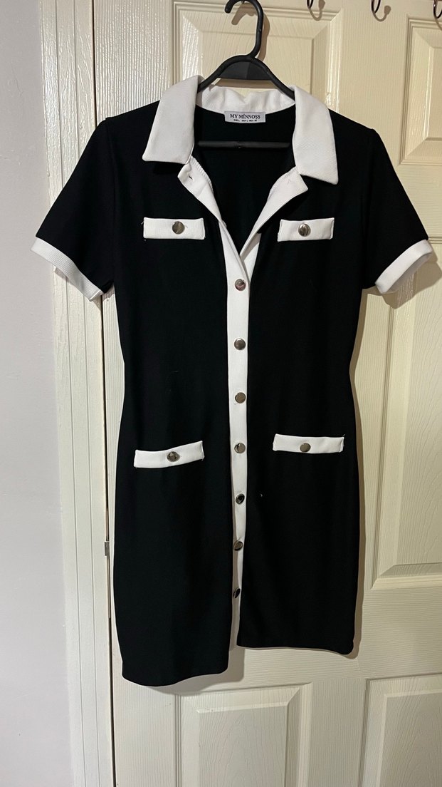 Düğmeli, kısa kollu, siyah midi elbise. Beyaz yakalı ve düğme detaylı, sentetik kumaştan, şık ve rahat günlük kullanım için uygun.