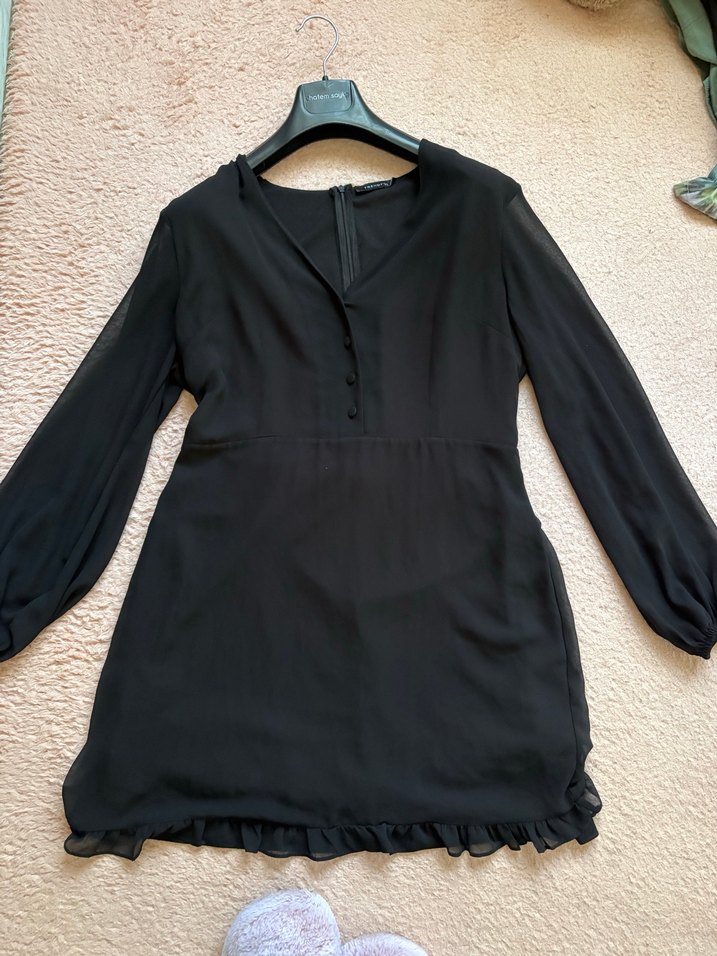 Siyah midi elbise, uzun kollu ve V yakalıdır. Düğme detayları ve bol kesimiyle minimalist gotik tarzda, sentetik kumaştan üretilmiştir.