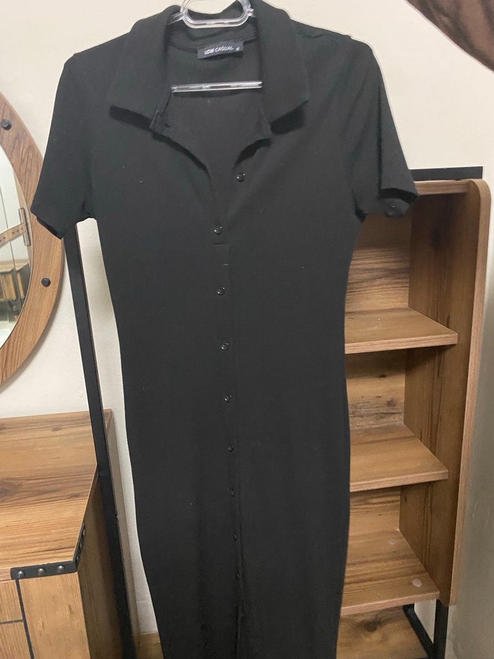 Düğmeli, kısa kollu, yakalı ve vücuda oturan siyah midi elbise, günlük ve ofis kullanımı için uygundur.
