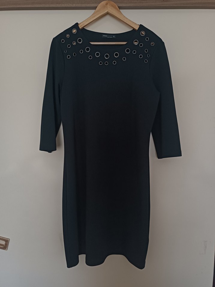 Düğmeli, bisiklet yaka siyah midi elbise, kısa kollu ve vücuda oturan kesime sahiptir. Minimalist gotik tarzda, sentetik kumaştandır. Ofis için uygundur.