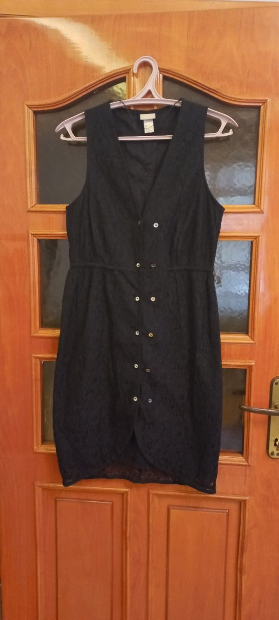 Düğmeli, kolsuz, siyah midi elbise, oturan kesim ve yakasında kesik detay bulunur. Ofis ortamı için uygundur. h&m 38 beden siyah dantel iç astarlı çok şık elbise ürün sorunsuzdur tertemiz iki kol arası 43cm boy96cm