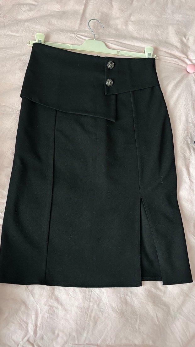 Düğmeli detaylı, siyah midi uzunlukta, ipeksi dokulu ve normal kesim kadın eteği. Ofis için goth tarzını yansıtır.