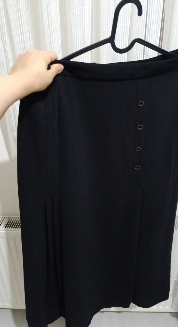 Siyah midi uzunlukta, düğmeli ve bol kesim kadın eteği. Sentetik kumaştan üretilmiş olup, ofis ve iş ortamları için uygundur.