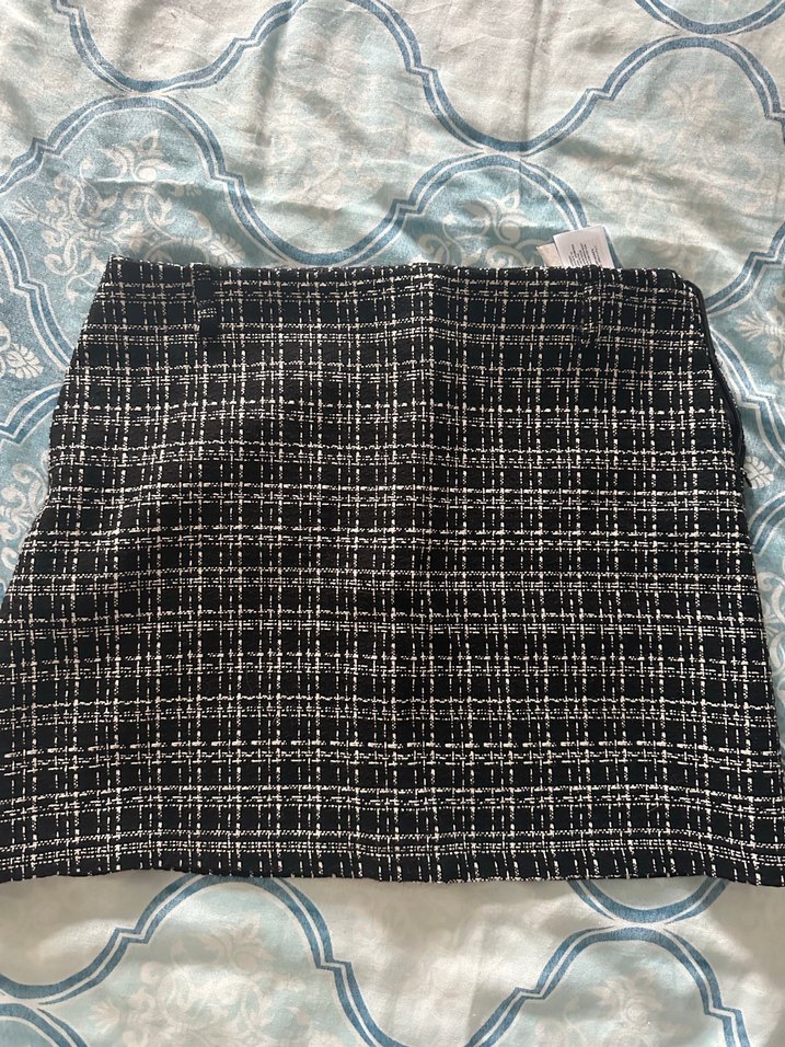 Düğmeli, siyah midi kadın eteği, normal kesim, hafif dokulu desene sahip. Ofis ve günlük sokak stili için uygundur.Dar kalıp medyum gibi