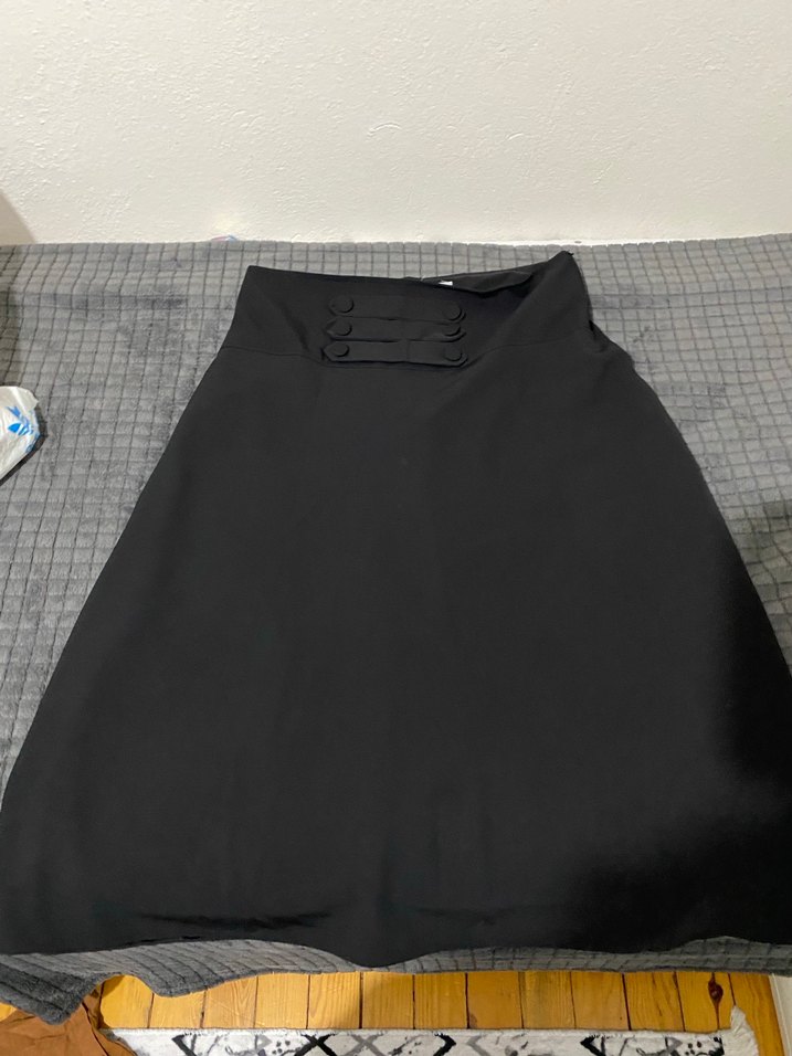 Düğmeli, bel kısmında düğmeler bulunan siyah midi etek. Düz ve sentetik kumaştan yapılmıştır. Ofis için uygun, regular fit.