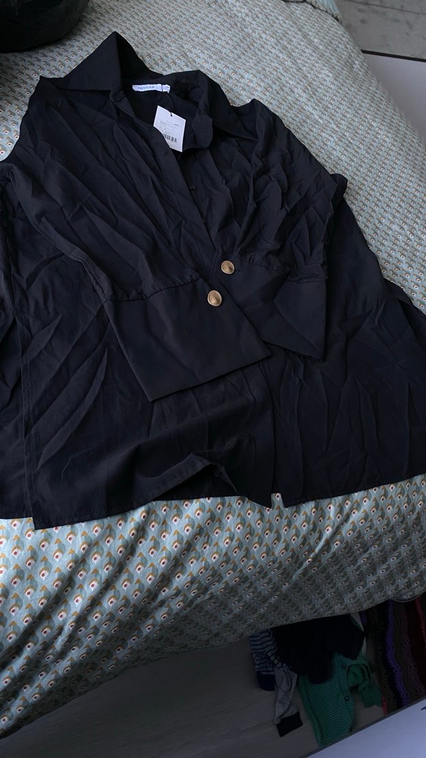 Düğmeli, bol kesim, siyah midi kadın gömlek. Uzun kollu, yakası notched lapel ve sentetik kumaştan üretilmiştir. Günlük rahat kullanım için uygundur.