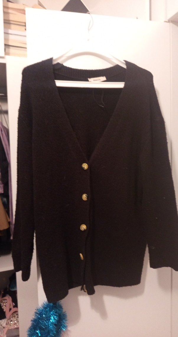 biraz tüy toplamış durumda s m l bedenlere uygun Siyah yün hırka, düğmeli ve uzun kollu, rahat kesimli. Notlu yaka detayıyla günlük kullanım için uygundur.