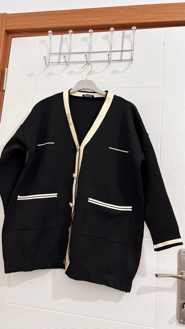 Düğmeli önü ve yakası beyaz şerit detaylı siyah midi hırka, uzun kollu ve normal kesimdir. Sentetik kumaştan üretilmiş, günlük rahat kullanım için uygundur. Ürün hiç kullanılmadı 68 cm boyu