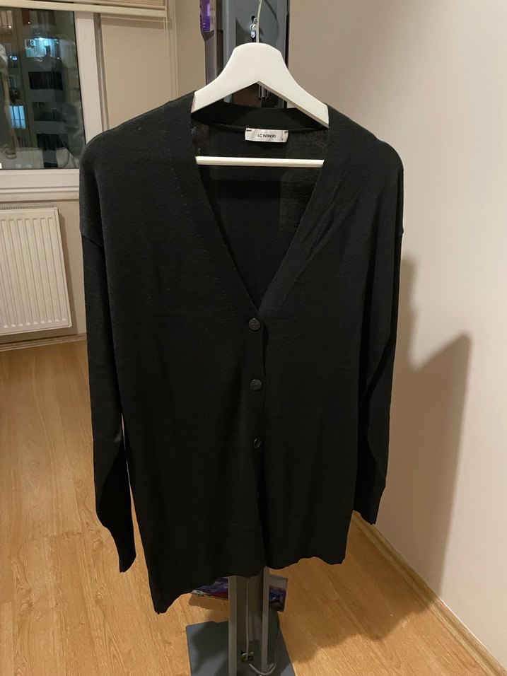 Düğmeli siyah hırka, uzun kollu ve notlu yaka tasarımıyla dikkat çeker. İpeksi kumaştan, bol kesim ve minimalist normcore stilde günlük kullanım için uygundur.