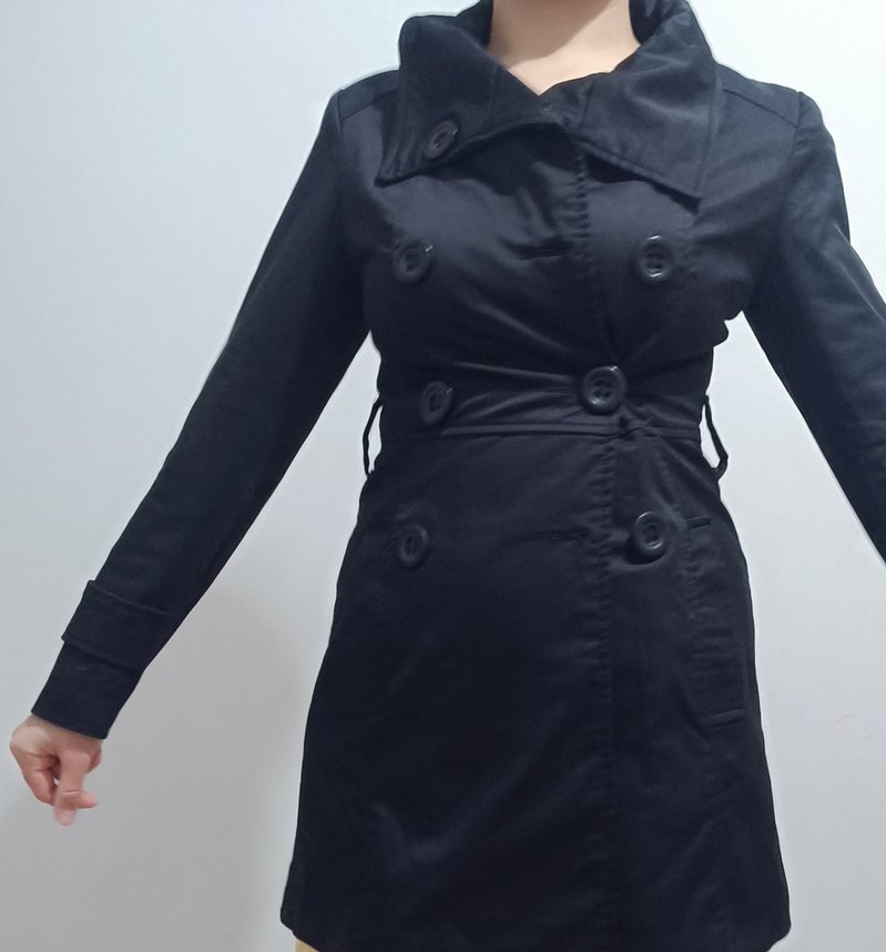 Düğmeli ön kısmı ve kesik yaka detayı olan siyah midi uzunlukta kadın kabanı. Yumuşak sentetik kumaştan, uzun kollu ve bol kesimdir, rahat günlük kullanıma uygundur.