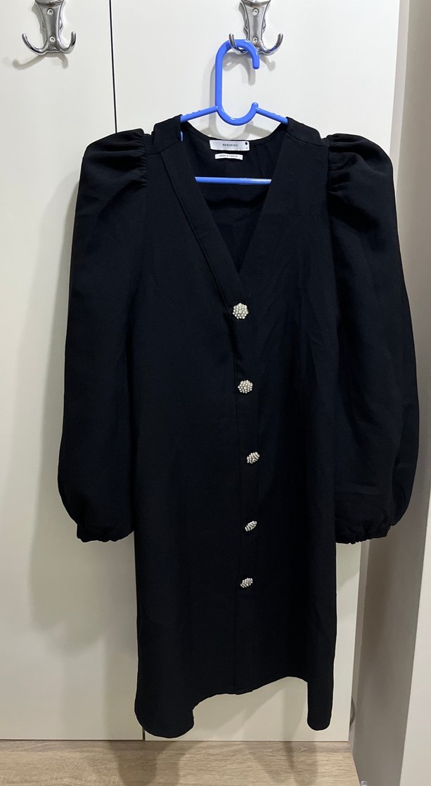 Düğmeli ve yakalı siyah midi kadın kaban, uzun kollu ve hafif kabarık omuz detaylıdır. Sentetik kumaştan, ofis ve günlük şıklık için uygundur.