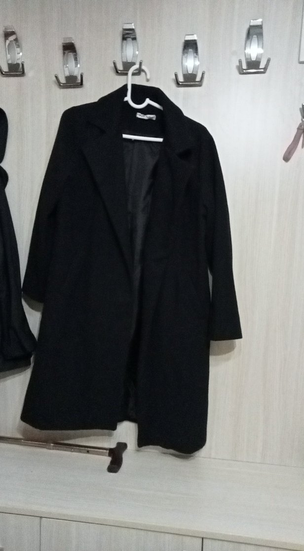 Düğmeli, siyah midi uzunlukta kadın kaban. Notlu yaka ve uzun kollu, rahat kesim. Yumuşak ve sıcak kumaştan, ofis için uygun.