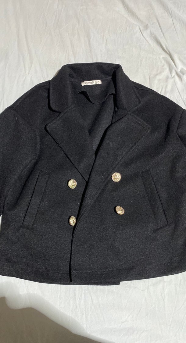 Düğmeli, siyah midi kadın kaban, yumuşak kumaştan, notched lapel yakalı ve uzun kolludur. Günlük kullanıma uygundur.