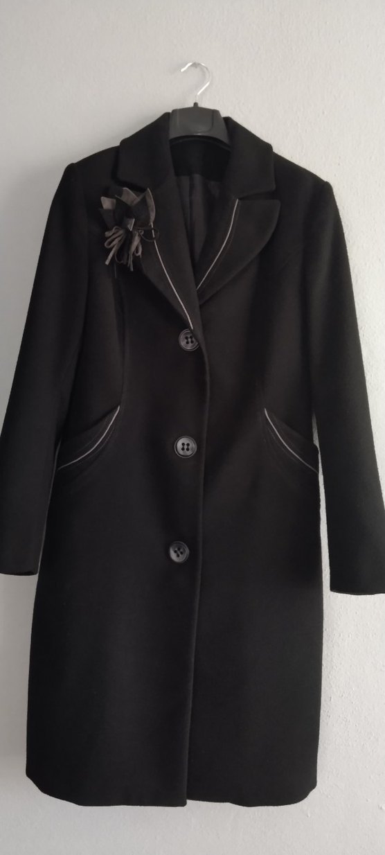 Düğmeli, siyah midi kaban. Notch yaka, regular kesim ve askılı kol detayı ile günlük kullanımı için uygun. 38-40 bedene uyumlu