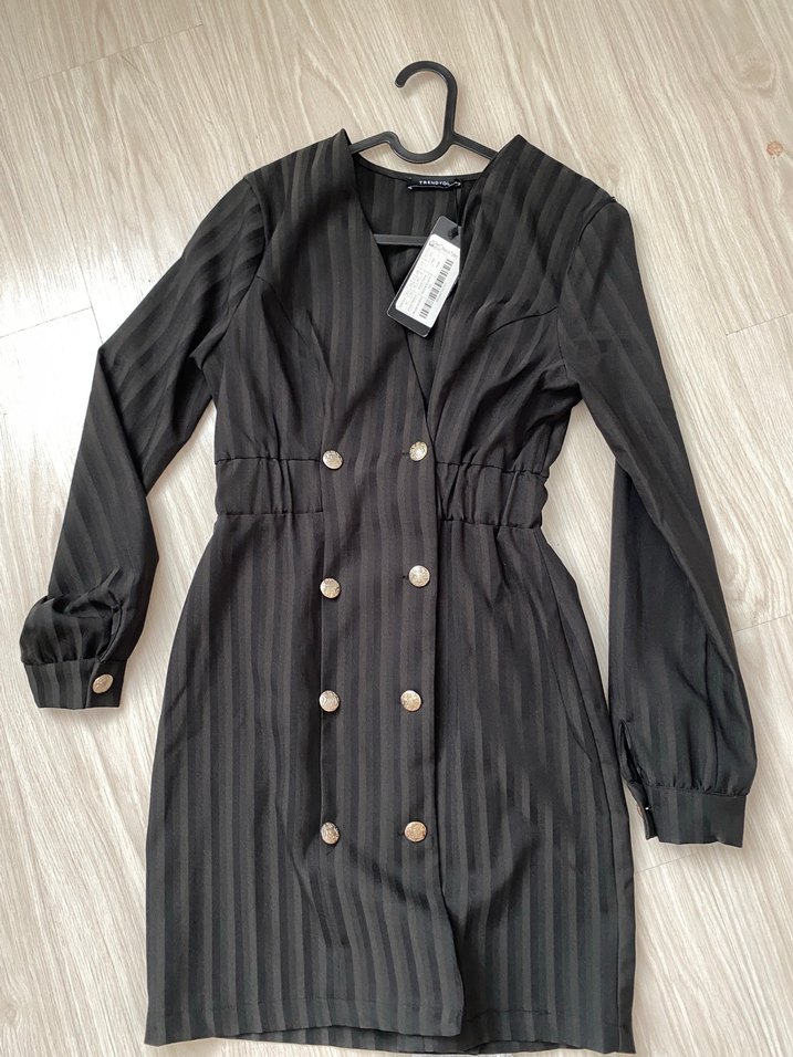 Siyahlı ve koyu yeşil çizgili , düğmeli, normal uzunlukta ceket elbise . V yaka, strappy kollu, sentetik kumaştan, ofis ve günlük kullanıma uygun şık kesim.
