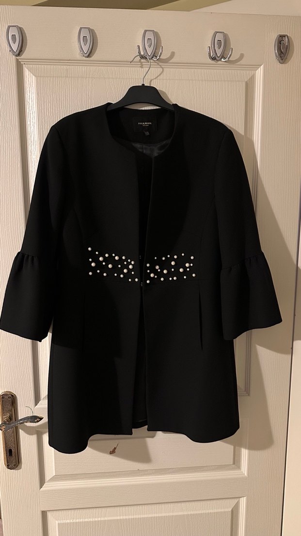 Düğmeli ve bel kısmında işlemeli detaylara sahip siyah midi kaban. Uzun kollu ve hafif volanlı, ofis kullanımı için uygun.