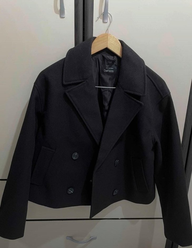 Düğmeli önü ve sivri yaka detaylı siyah kadın kaban. Normal kesim, uzun kollu ve midi boyda, ofis ve günlük kullanım için uygun. Yumuşak ve sıcak kumaştan üretilmiştir.