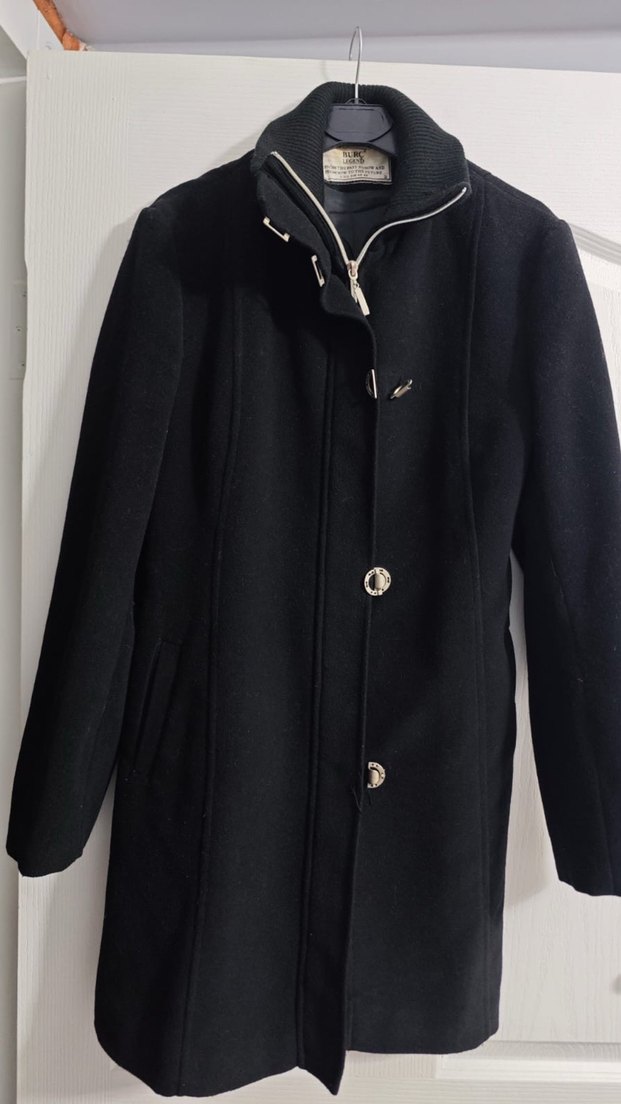 Düğmeli ve kesik yakalı bu kadın kabanı, midi boyda ve klasik siyah renkte. Uzun kollu, düzenli kesim ve yumuşak, sıcak dokulu kumaştan üretilmiştir.