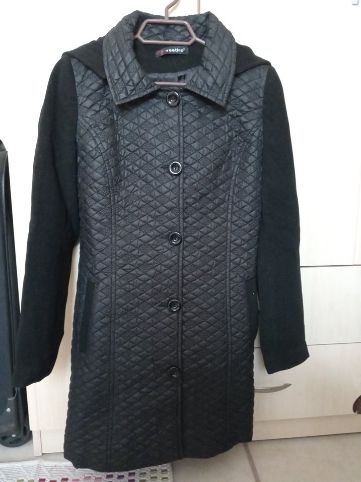 Düğmeli ön kısmı ve kesik yakası olan bu kadın ceketi, uzun kollu ve sentetik kumaştan üretilmiştir. Ön kısmı kapitone desendir ve midi uzunlukta, normal kesimdedir. Desensiz, günlük ve iş tarzına uygun şık bir ceket.